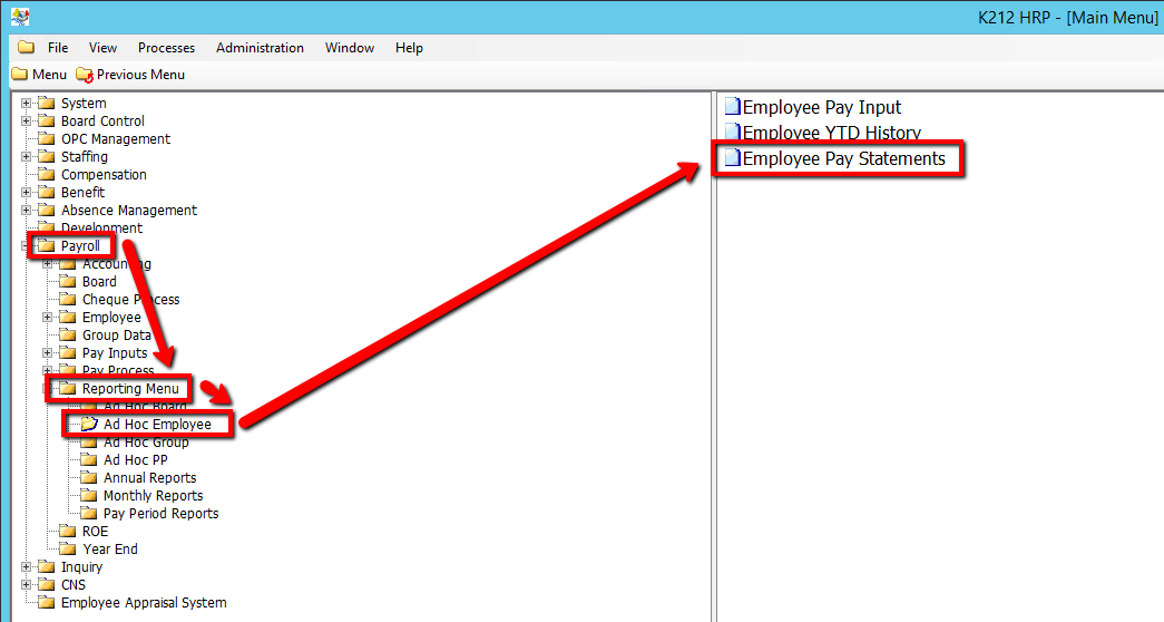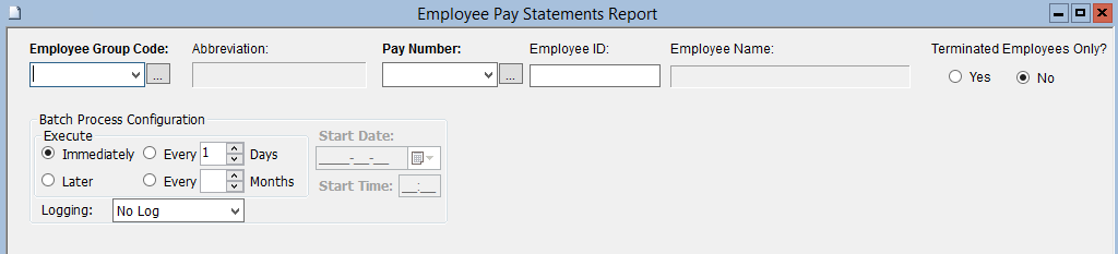 This screen is used to generate a pay statement for printing. Statements can be filtered by entering group code, pay number and/or employee ID.