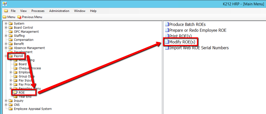 This screen allows administrators to pull up ROEs based on the search criteria entered in Screen Element 2. ROEs can be modified by employee, batch number, etc. All ROE records from the EC_EMPLOYEE_ROE table that match the search criteria will be displayed. This process can be run after creating Batch ROEs and before running the Print ROE(s) process if necessary.
