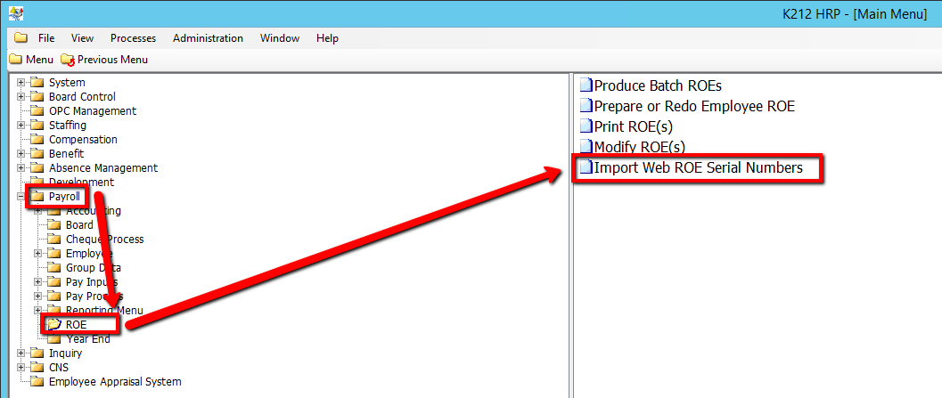 This process will import Serial #s into K212 HRP from the XML file downloaded from the Service Canada Website. Maintaining the Serial# in K212 HRP enables K212 HRP to be used to issue amended ROEs via ROE Payroll extract file transfer - by providing the Serial Number of amended ROEs in Block #2. This process should be run right after the Print ROE(s) process is complete and the ROEs have been uploaded to ROE Web / Service Canada’s website.