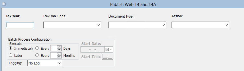 This screen publishes the generated T4 & T4A forms to the K212 Portal. Web T4 and T4A documents are generated by the T4 and T4A Generation module (refer: Payroll > Reporting Menu > Annual Reports); however, employees cannot access their T4 or T4A documents via the web until they have been published.