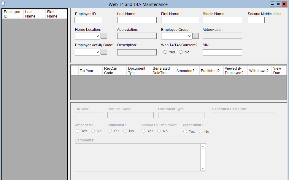This screen provides access to view an employee’s T4 and T4A documents as created by the “T4 and T4A Generation” module (refer to Payroll > Reporting Menu > Annual Reports).