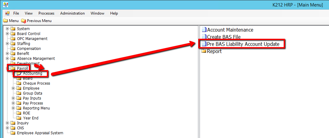 This background process is used to create entries in the accounting transaction file which will be imported to the BAS system. It updates the accounting table with liability codes for TAX, CPP and UI specified for each Revenue Canada code. This process must be run before the "Create BAS file" program to ensure that the correct Liability Account Codes are used for TAX, CPP and EIC if you have entered Liability Account Codes in the Liability Account Code screen