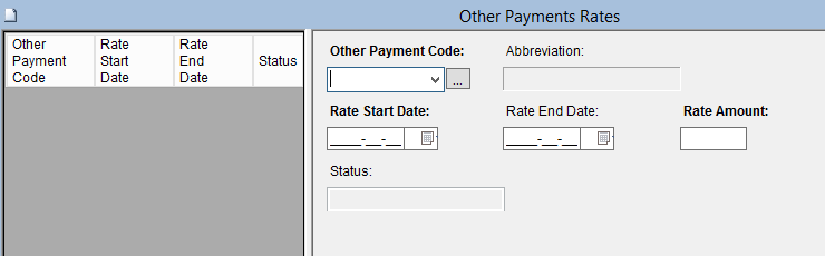 This screen allows the user to add, delete, duplicate or modify a Payment Rate for Other Payments. A Payment Rate is used when there is a standard rate to be used with a specific Payment Code.