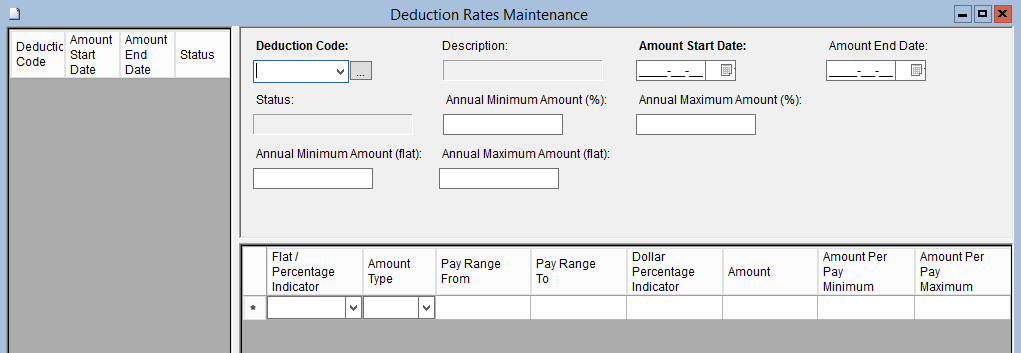 This screen is used to define how the amount of each deduction is calculated. Some examples are flat rates or a percentage of a pay range or pay amount.