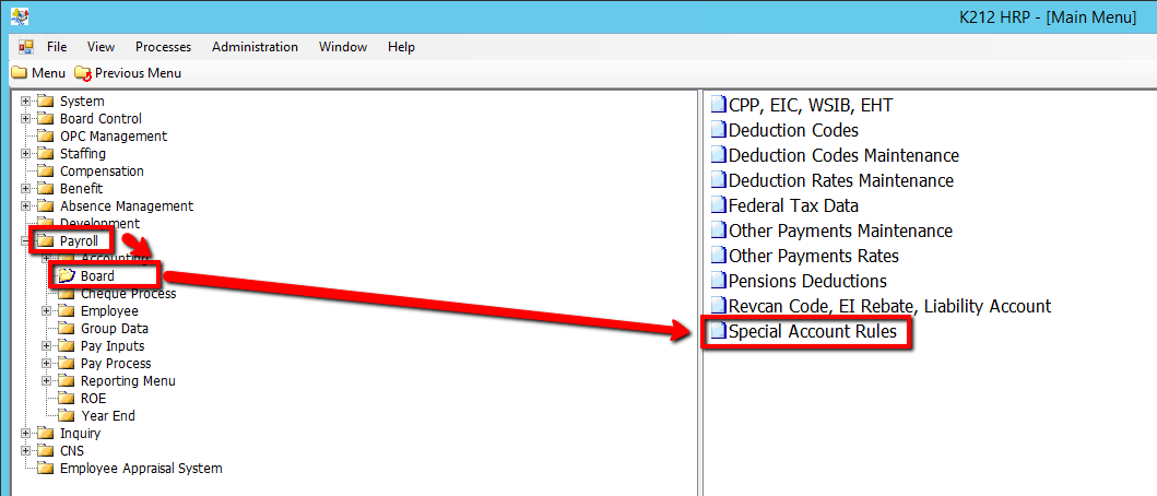 This screen is used to add, modify or delete Special Account Rules which define how a GL Account Number is modified. Rules are used only by Boards where the account code structure is such that normal K212 HRP account rules are insufficient to generate the accounting entries for the various expense accounts. Boards that have an account code structure which works with the standard K212 HRP account rules should ignore this table.