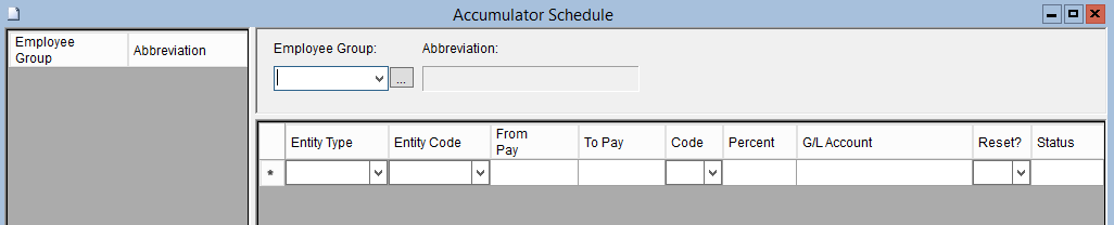 This screen is used to add and modify Accumulator Schedule parameters at the Group Level. These settings can be overridden at the Employee Level.