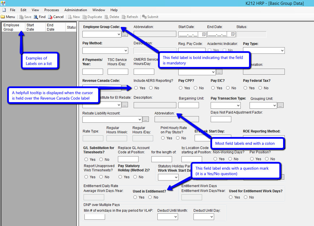 Data in K212 HRP is displayed on the screen in “fields”. Each field is identified by it’s field label.
