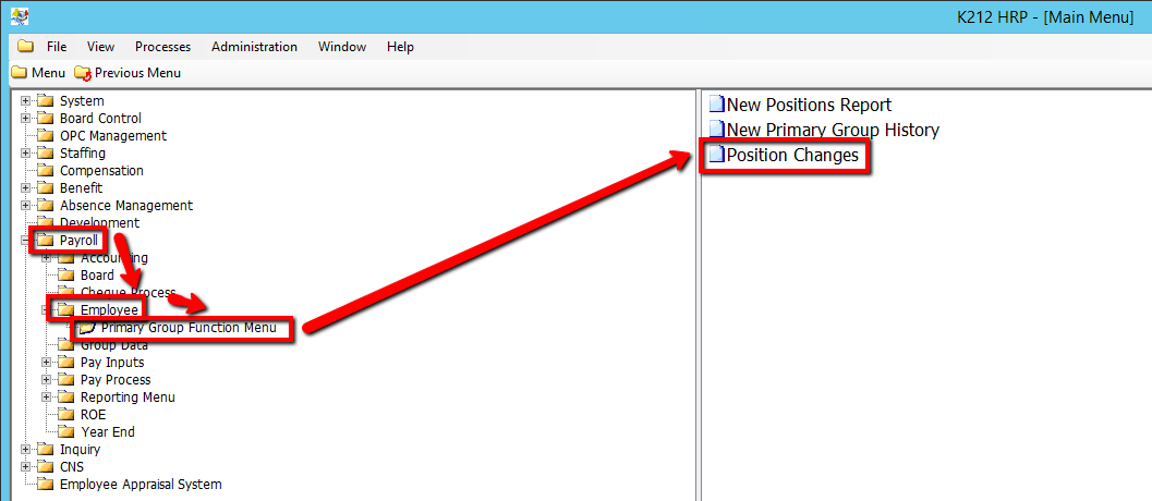 This screen is used to search for employee position changes that have occurred for an Employee Group, during a specific date range. Search results appear as a view only list, which is used to help determine whether a New Primary Group should be assigned to an employee in the New Primary Group/History screen.