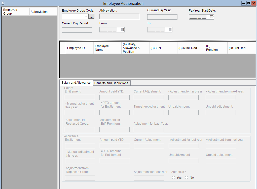 This screen is used to authorize all changes made to records and all adjustments made by the last Entitlement run. It only authorizes records that have been through the Entitlement process, so there is no risk of authorizing a record that does not yet have an appropriate Entitlement adjustment. Position records are also authorized when Salary and Allowance records are authorized.