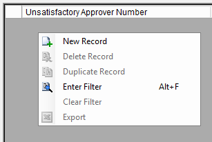 3.. Right click the grey grid under the Unsatisfactory Approver Number column and select a New Record