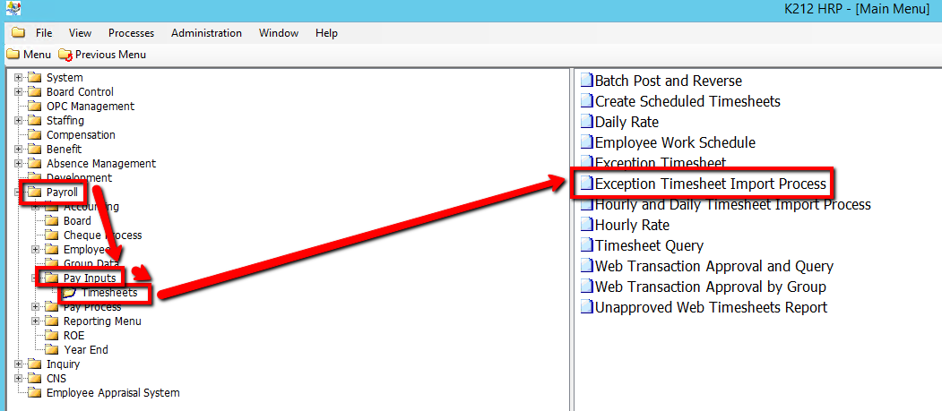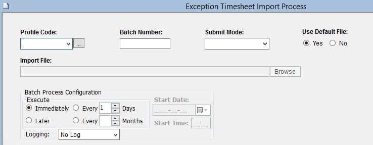 This screen is used to run a background process that imports exception timesheets. This background process uses the rules created in a user-defined import profile in order to know how to import data in the file to be imported.