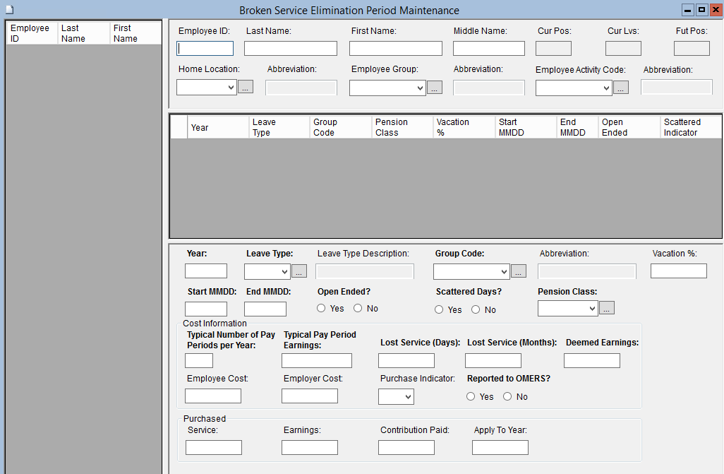 This screen is used to add, modify or delete unpaid Employee Leave that represents OMERS Broken Service or Elimination Period records for an Employee. All records entered must be within one calendar year. For this reason, the year is entered as a separate column. There is also an option in K212 HRP to import these records from the DNP table using the Import Broken Service from Days Not Paid screen (located at: Payroll > Pay Process > OMERS).