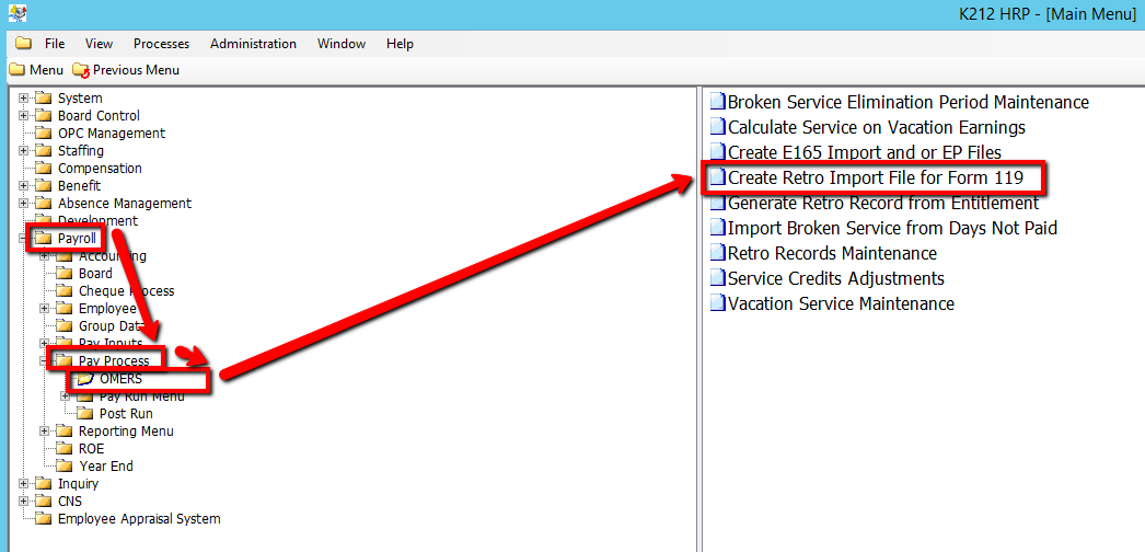 The process creates the Retro payment Import file for OMERS Form 119 reporting and updates an indicator on the retro records to prevent double reporting on future runs. It contains all amounts paid in the reporting year as retro payments for prior years (as recorded in the Retro Records Maintenance screen).
