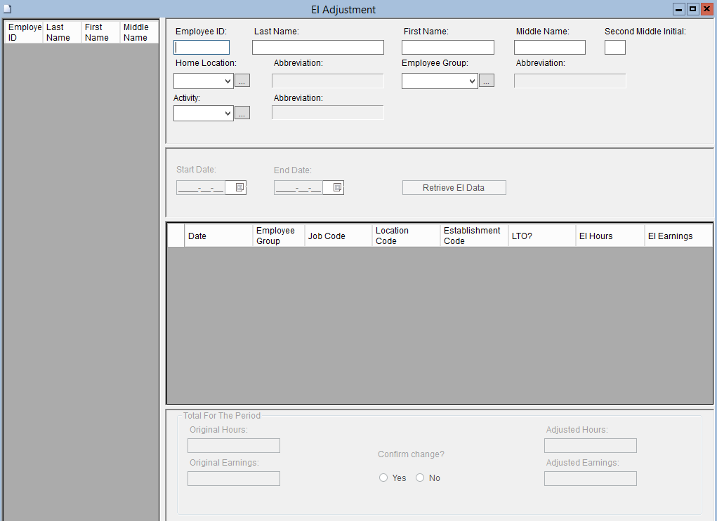 This screen is used to make adjustments on an Employee's EI deductions by manually adjusting the hours and earnings on a table that is used to produce Records of Employment (ROE).