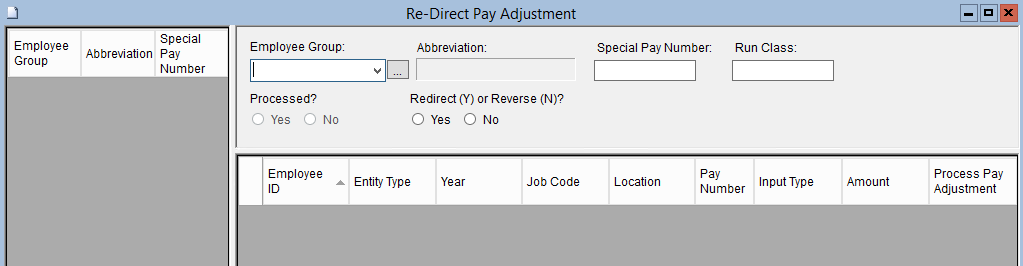 This screen is used to select a pending pay adjustment for one or more Employees and redirect or reverse the amounts to be processed on a Special Pay Run. Since the Entitlement process always assigns its adjustments to a regular pay by default, a Special Pay must be created prior to entering on this screen.