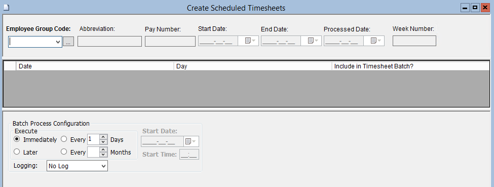 This screen is used to create Scheduled Timesheets for the purpose of populating the Hourly Timesheet Entry Component on K212 portal and produce the Employee Scheduled Timesheet report and Employee Scheduled Timesheet Error report.