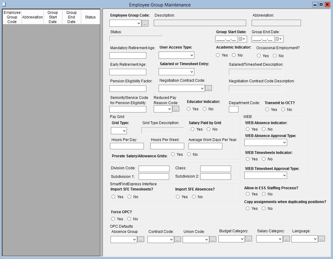 This screen allows addition of new or modification of existing Employee Groups. Employee Group parameters have a widespread impact on the system. They are key to setting rules within Positions, Benefits, Pay runs, Deductions, Absence, Vacation, Salary Grids, pay period calendars, overtime and shift premiums, etc for each Employee Group.