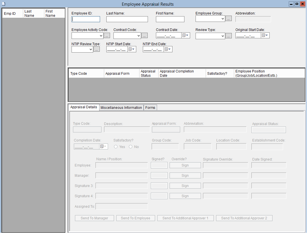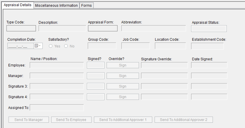This screen is used to modify Employee Appraisal Results and view Appraisal Forms. It allows you to Override incomplete Appraisals to ensure that the process continues to move forward. The number of forms and signatures required to complete an Appraisal are pre-defined in the Appraisal Code Maintenance screen, Appraisal Type Codes and Appraisal Form Type Codes are then attached to an employee through the Employee Appraisal Maintenance screen.