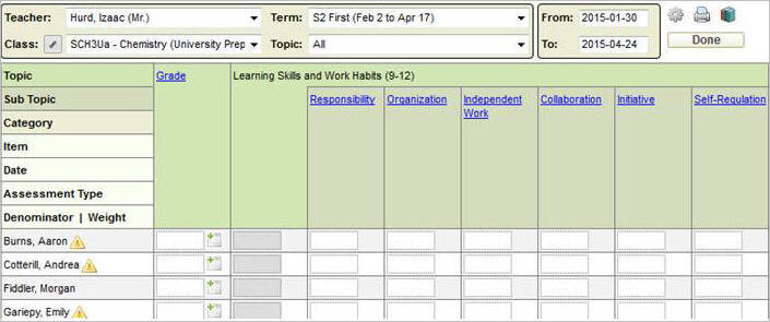 Group by Class/Homeroom: When you have all classes selected, checking this box will cause all topics from each class to be grouped together. Unchecking it will cause all topics to be listed one after another regardless of class. Either option can be helpful depending on your method of mark and comment entry/review.