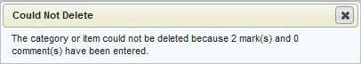 When attempting to delete the category, you will be reminded that any items under this category will also be deleted, however, you will be prevented from deleting a category in which there are any marks or comments: