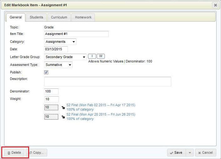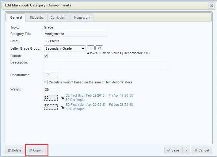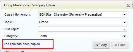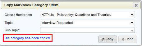 When you edit a category, you will have access to a Copy button at the bottom so that you can copy this category to another topic within this class (e.g. if maintaining multiple markbooks for one class) or to another class completely.