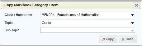 Your copy Markbook Category/Item screen will default to the current class and topic but you can change it to copy to any one of your classes.