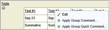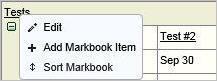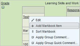 Add a new markbook item by clicking the category hyperlink then select Add Markbook Item: As shown below, clicking the category title Tests will show the Add Markbook Item option:
