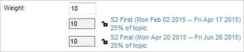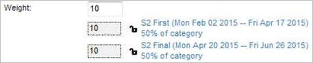 When entering weights in a cumulative markbook, there is only one weight value that can be entered and this value will get populated to all applicable terms in the markbook. An example of the weights area is shown below. You can enter the weight into the top box, and it will get copied into the appropriate terms below. The ‘unlocked’ symbol does not necessarily mean the term is unlocked, just that the category is going to be applied to that term. Here is an example of a category added during the first report card term for the class, and its weight is set to 10. The same weighting will appear in the second term automatically so that the marks entered in term 1 (first term) are also considered in the calculation of the term 2 (final) report card mark (the final mark considers all the marks for the entire year).