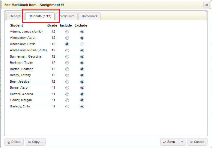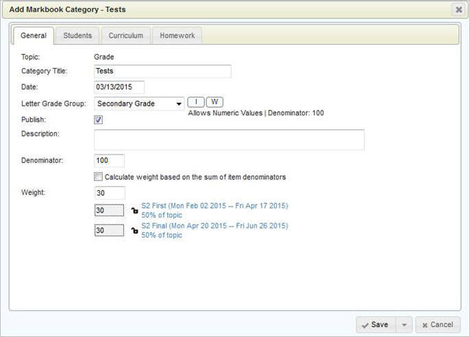 The add/edit category interface has 4 tabs. The General tab is where the category must be defined accurately. The Students tab presents the students in the class and allows the teacher to exclude students from the category as explained in Excluding Students from Category or Markbook Item. The Curriculum tab allows a teacher to associate curricular elements with a markbook category or item, while the Homework tab allows homework to be associated with the category or markbook item.