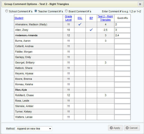 Show deleted students: When this option is selected, students who have a deleted enrolment status, and students who have dropped the class, will appear in the list but with strikeout text. (e.g., Pilon, Kyle)