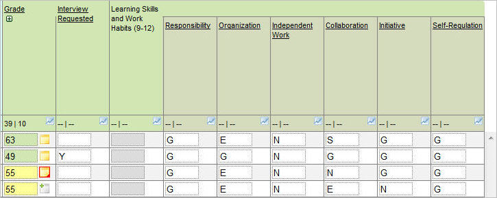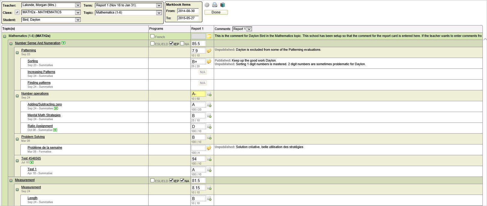 Reminder: The markbook information was used to calculate the report card mark (e.g. grade column), however, the calculated mark can be overwritten. Overwritten marks appear with a yellow background, and deleting the overwritten mark will return the mark to the calculated mark based on the markbook.
