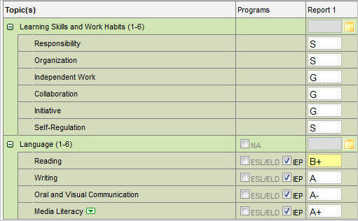 You can also collapse the topic. In the above example, clicking the minus sign under the Grade topic will cause the categories and markbook items for the topic to be hidden (collapsed), as shown below. This may be particularly useful when entering report card information where you might want to hide the markbook information.
