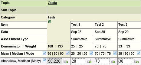 Here is an example 3 tests with a denominator totaling 133, and therefore, the Tests category is weighted as 133 toward the overall report card mark. Also note that each test is weighted the same as the test denominator.