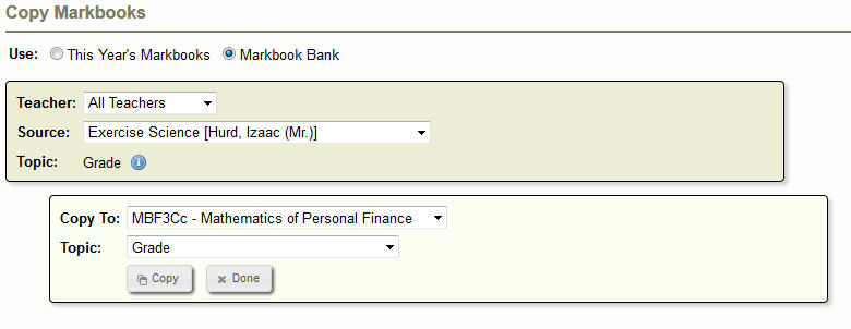Markbooks can be copied from any teacher’s class but only INTO your own class(es).
