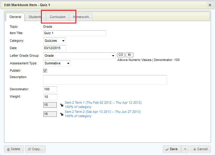 Curriculum is linked to markbook categories or markbook items, and is accessed using the Curriculum tab available when either adding or editing the category or item. If unfamiliar with adding/editing markbook items or categories, please see Setting Up a Markbook.