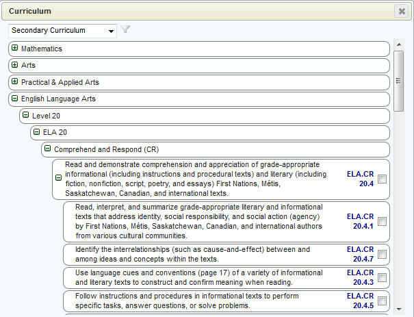 2. Choose either Secondary or Elementary Curriculum, then drill down and check the box or boxes corresponding to the curriculum item(s) you wish to use. Click Save when finished: