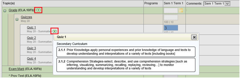 This next feature, is only available in the Marks/Comments by Student interface, as the curriculum arrows for the topic/subtopics (e.g. report card marks) are not available in Marks/Comments by Class. Clicking the arrow beside a topic/subtopic (Grade in this example) will expand or and collapse the curriculum details. For example, clicking the green down arrow in the above image will expand to show the information in the image below, and clicking the arrow again will collapse it.