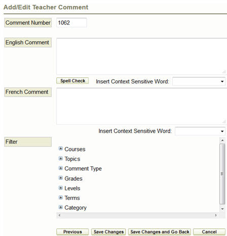 If you wish to add filters to the comment, you may select from Courses, Topics, Comment Type, Grades, Levels, Terms or Categories. For example, you can create a comment that indicates a strength in the student’s performance. When searching for a suggested comment, you can use the filters to display only the comments that are of the Comment Type “Strengths”. Any number of filters can be assigned to a comment.