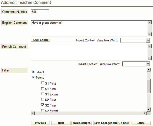 Make your changes and click either Previous, Next, Save Changes or Save Changes & Go Back. Cancel will return you to your list of comments without saving any changes.