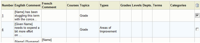 You can create and manage a bank of comments that are only available to you. To access your comment bank, click on My Comments from the Achievement menu. You will see a screen similar to the one below.