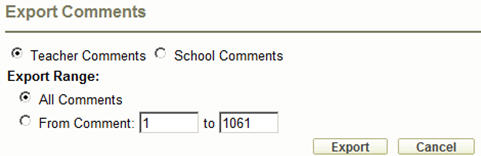 To export your file click on the red arrow button in the top right hand corner of the My Comments screen. Select Teacher Comments or School Comments. You can export either all of the comments or a range of comments from the selected bank. Click the Export button to create a text file based on the selected parameters. Click Cancel if you do not want to export your comments at this time and return to the My Comments screen.