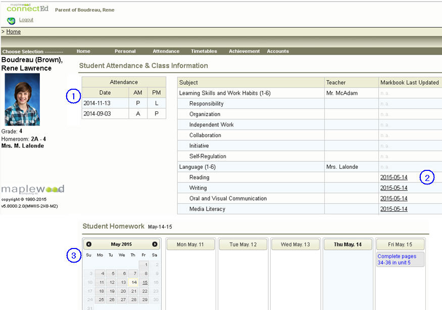 The student/parent can see relevant information at a glance in regards to attendance, achievement and homework. Classes are listed at the top with the markbook date and attendance beside each class. The user can click on the markbook date to see the details of that markbook, and on the homework title to see the details of that homework.
