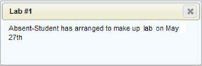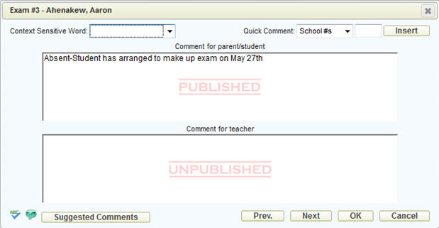 The teacher can make comments on a markbook item or category for each student. They can enter information into the unpublished area, for their own use, or they can enter information that will be visible to parents. The below screen shot shows a published (for parent/student) comment that has been entered for this student: