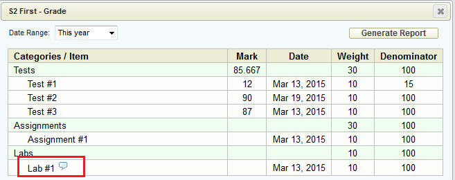On the parent/student site, when viewing the detailed markbook, a small text bubble will appear when a published comment has been entered: