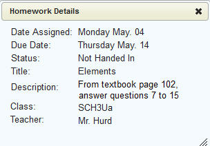 When setting up a markbook item, the teacher can define any number of homework items. These homework items will then display on their due date, to the parents/students on the home screen.