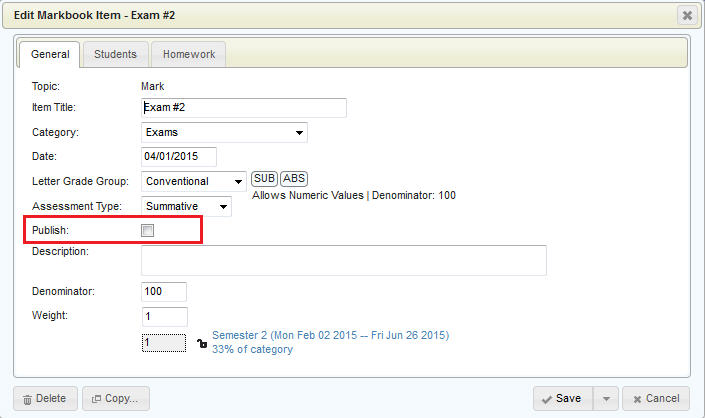 Individual markbook items can be marked as non-published by the teacher, and these items will not show at all to the parents/students. An entire markbook category can also be marked as non-published, and this will cause all items underneath that category to be hidden from parents/students.