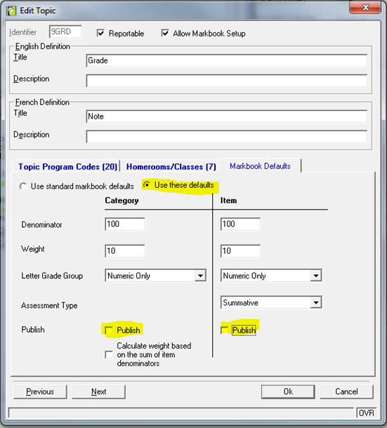 The school has the ability to set markbook defaults for any topic. This can affect the default letter grade group, denominator and weight, but it can also affect the default published/unpublished setting for items and categories.