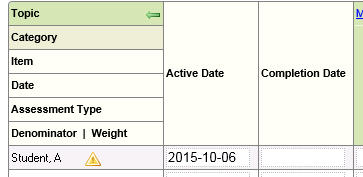 Classes that the office have flagged as Continuous Entry will show a unique green arrow in the Topic cell as shown below. Click this arrow once to display the columns Active Date and Completion Date, and click the arrow again to hide these two columns. The teacher may view and/or edit the dates that the student starts and completes a continuous entry class. Continuous entry classes allow students to start and finish a class at their own pace.