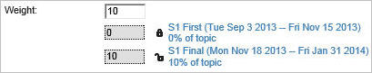 When entering weights in a non-cumulative markbook, the teacher checks off the terms that will use the category, and then enters the weight of the category for the each selected terms. Only the unlocked terms may be edited and each term can have a different weight. Here's an example, showing a category that is weighted as 10 for the 3 report card periods. The % of the topic mark will vary depending upon the other categories selected in each term.
