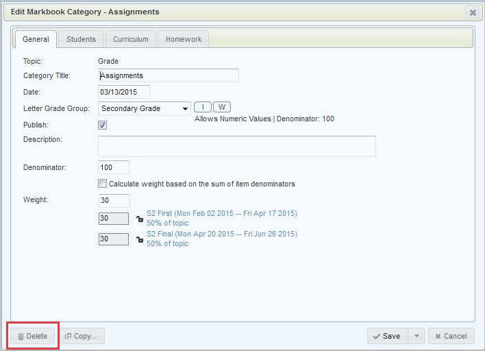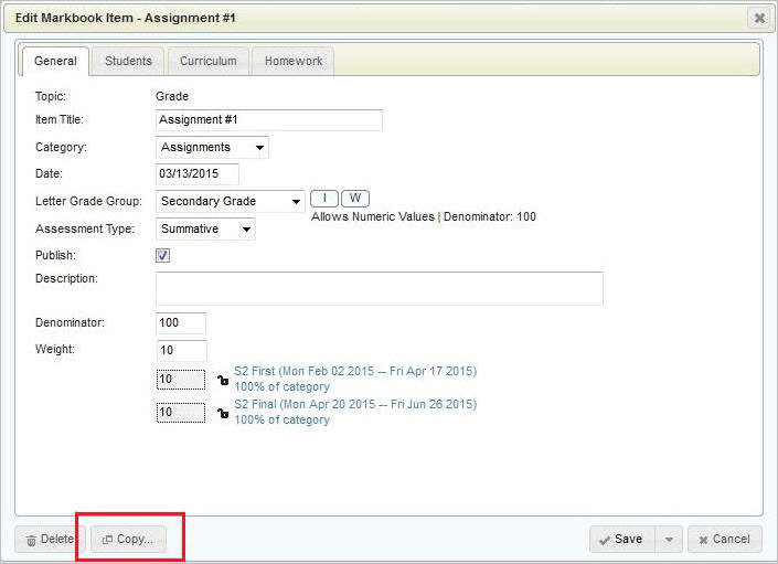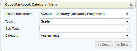 When you edit a category, you will have access to a Copy button at the bottom so that you can copy this category to another topic within this class (e.g. if maintaining multiple markbooks for one class) or to another class completely.